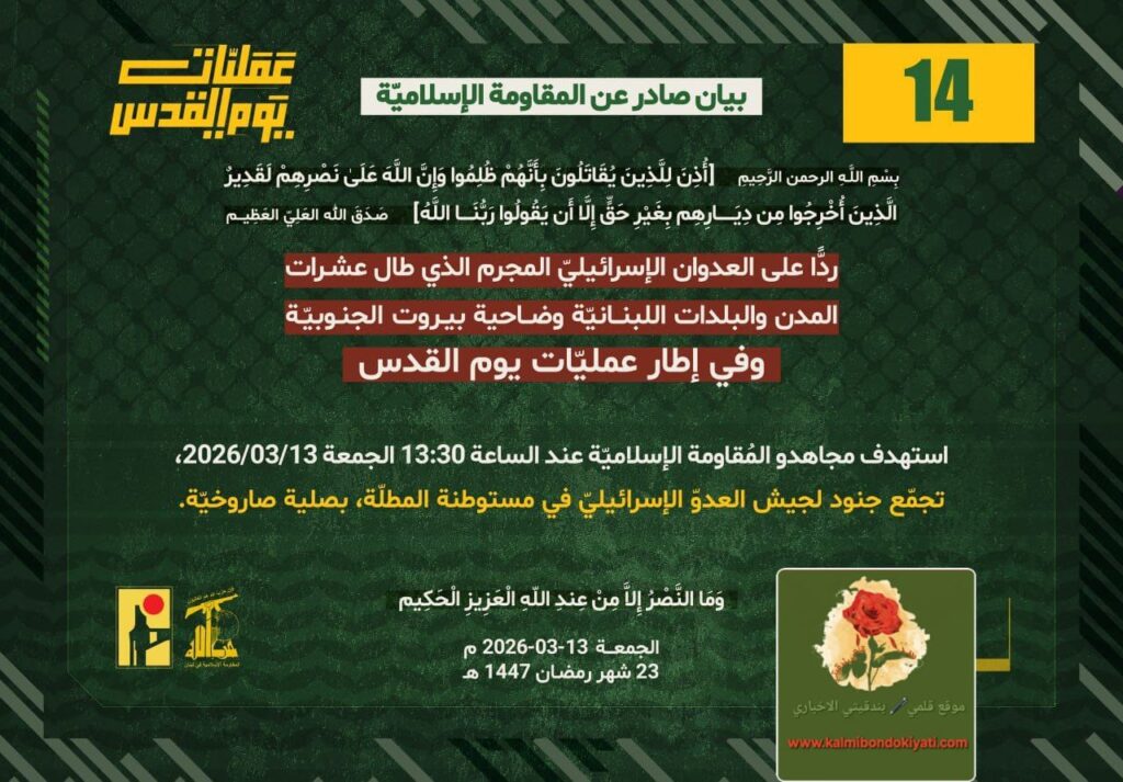 ุฃุตุฏุฑุช ุงู„ู…ู‚ุงูˆู…ุฉ ุงู„ุงุณู„ุงู…ูŠุฉ ุจุนุฏ ุงู„ุจูŠุงู† ุฑู‚ู… “13” ู…ุจุงุดุฑุฉ ุจูŠุงู† ุฑู‚ู… “14” :โ€ุฑุฏู‘ู‹ุง ุนู„ู‰ ุงู„ุนุฏูˆุงู† ุงู„ุฅุณุฑุงุฆูŠู„ูŠ ุงู„ู…ุฌุฑู… ุงู„ุฐูŠ ุทุงู„ ุนุดุฑุงุช ุงู„ู…ุฏู† ูˆุงู„ุจู„ุฏุงุช ุงู„ู„ุจู†ุงู†ูŠู‘ุฉ ูˆุถุงุญูŠุฉ ุจูŠุฑูˆุช ุงู„ุฌู†ูˆุจูŠู‘ุฉุŒ ูˆููŠ ุฅุทุงุฑ ุนู…ู„ูŠู‘ุงุช ูŠูˆู… ุงู„ู‚ุฏุณุŒ ุงุณุชู‡ุฏู ู…ุฌุงู‡ุฏูˆ ุงู„ู…ูู‚ุงูˆู…ุฉ ุงู„ุฅุณู„ุงู…ูŠู‘ุฉ ุนู†ุฏ ุงู„ุณุงุนุฉ 13:30 ุงู„ุฌู…ุนุฉ 13/03/2026ุŒ ุชุฌู…ู‘ุน ุฌู†ูˆุฏ ู„ุฌูŠุด ุงู„ุนุฏูˆู‘ ุงู„ุฅุณุฑุงุฆูŠู„ูŠู‘ ููŠ ู…ุณุชูˆุทู†ุฉ ุงู„ู…ุทู„ู‘ุฉุŒ ุจุตู„ูŠุฉ ุตุงุฑูˆุฎูŠู‘ุฉ.