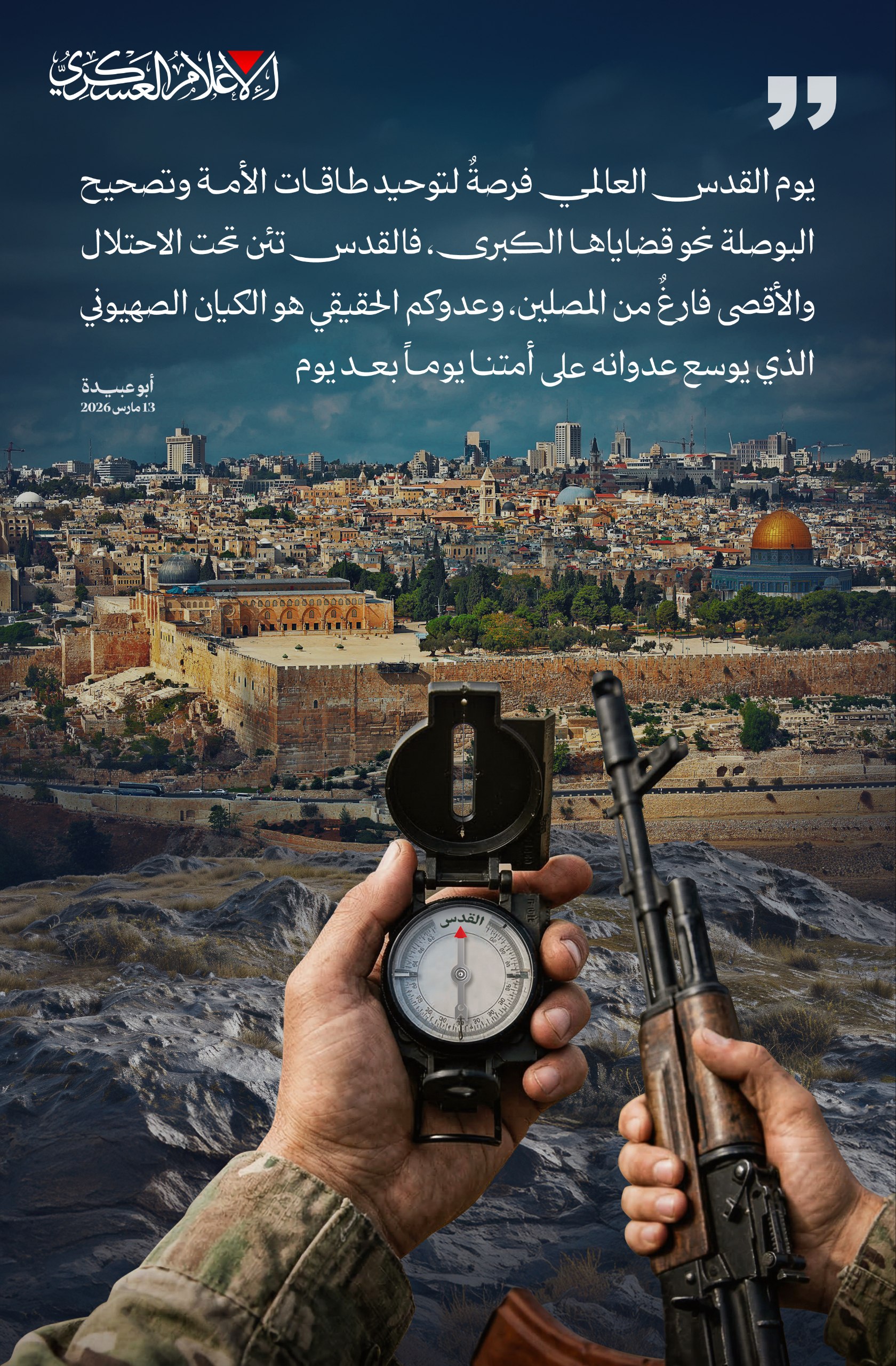 نشرت كتائب القسام الاقتباس عن الناطق العسكري أبو عبيدة جاء فيه:”يوم القدس العالمي هو فرصةٌ لتوحيد طاقات الأمة وتصحيح البوصلة نحو قضاياها الكبرى فالقدس تئن تحت الاحتلال ومسجدكم الأقصى فارغٌ من المصلين، وعدوكم الحقيقي هو الكيان الصهيوني الذي يوسع دائرة عدوانه على أمتنا يوماً بعد يوم.،تابع التغريدة:”إن يوم القدس العالمي الذي أحيته جماهير شعوبنا الإسلامية نصرة لفلسطين، لهو فرصةٌ لتوحيد طاقات الأمة وتصحيح البوصلة نحو قضاياها الكبرى، فالقدس تئن تحت الاحتلال ومسجدكم الأقصى فارغٌ من المصلين، وعدوكم الحقيقي هو الكيان الصهيوني الذي يتربص بكم، ويوسع دائرة عدوانه على أمتنا يوماً بعد يوم.”