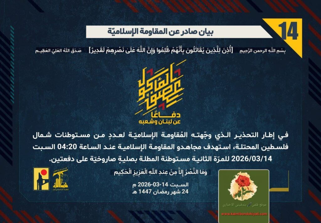 أصدرت المقاومة الاسلامية بعد البيان رقم (13) مباشرة بيان رقم (14) :”دفاعًا عن لبنان وشعبه، وفي إطار التحذير الذي وجّهته المُقاومة الإسلاميّة لعددٍ من مستوطنات شمال فلسطين المحتلة، استهدف مجاهدو المُقاومة الإسلاميّة عند الساعة 04:20 السبت 14/03/2026، للمرّةالثانية، مستوطنة المطلة بصليةٍ صاروخيّة على دفعتين.