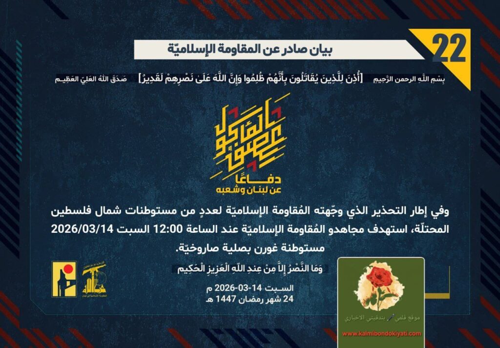 ุฃุตุฏุฑุช ุงูู ูุงูู ุฉ ุงูุงุณูุงู ูุฉ ุจุนุฏ ุงูุจูุงู ุฑูู ’21’ ู ุจุงุดุฑุฉ ุจูุงู ุฑูู “22′ :โุฏูุงุนูุง ุนู ูุจูุงู ูุดุนุจูุ ููู ุฅุทุงุฑ โุงูุชุญุฐูุฑ ุงูุฐู ูุฌููุชู ุงูู ููุงูู ุฉ ุงูุฅุณูุงู ููุฉ ูุนุฏุฏู ู ู ู ุณุชูุทูุงุช ุดู ุงู ููุณุทูู ุงูู ุญุชููุฉุ ุงุณุชูุฏู ู ุฌุงูุฏู ุงูู ููุงูู ุฉ ุงูุฅุณูุงู ููุฉ ุนูุฏ ุงูุณุงุนุฉ 12:00 ุงูุณุจุช 14/03/2026 ู ุณุชูุทูุฉ ุบูุฑู ุจุตููุฉ ุตุงุฑูุฎููุฉ.