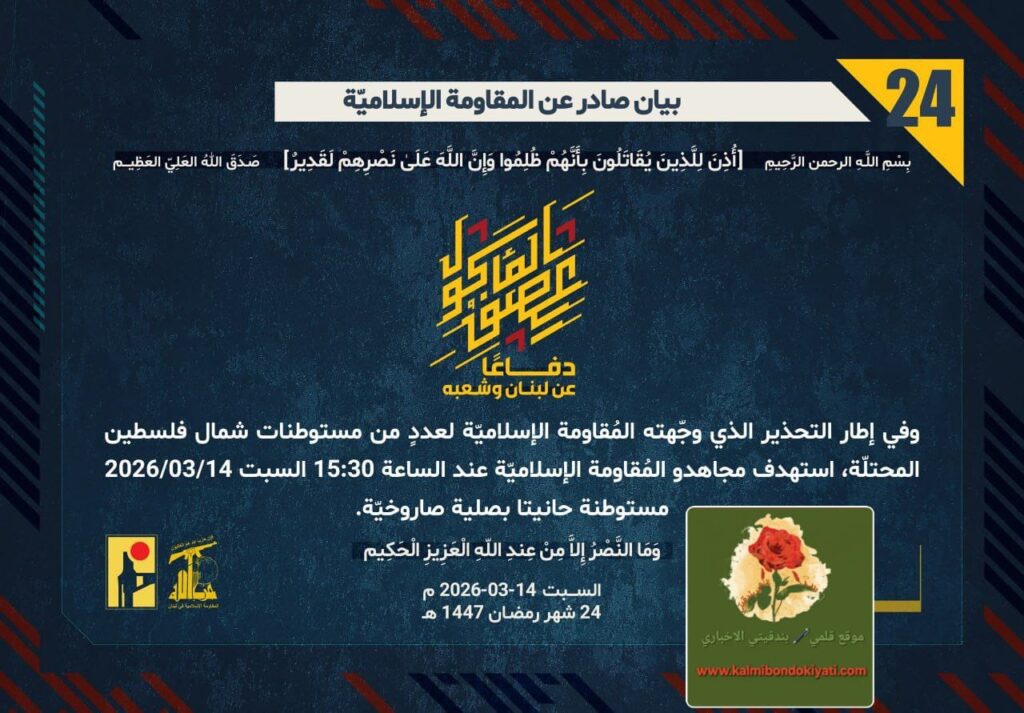 ุฃุตุฏุฑุช ุงูู ูุงูู ุฉ ุงูุงุณูุงู ูุฉ ุจุนุฏ ุงูุจูุงู ุฑูู ’23’ ู ุจุงุดุฑุฉ ุจูุงู ุฑูู ’24’ :โุฏูุงุนูุง ุนู ูุจูุงู ูุดุนุจูุ ููู ุฅุทุงุฑ โุงูุชุญุฐูุฑ ุงูุฐู ูุฌููุชู ุงูู ููุงูู ุฉ ุงูุฅุณูุงู ููุฉ ูุนุฏุฏู ู ู ู ุณุชูุทูุงุช ุดู ุงู ููุณุทูู ุงูู ุญุชููุฉุ ุงุณุชูุฏู ู ุฌุงูุฏู ุงูู ููุงูู ุฉ ุงูุฅุณูุงู ููุฉ ุนูุฏ ุงูุณุงุนุฉ 15:30 ุงูุณุจุช 14/03/2026 ู ุณุชูุทูุฉ ุญุงูููุง ุจุตููุฉ ุตุงุฑูุฎููุฉ.