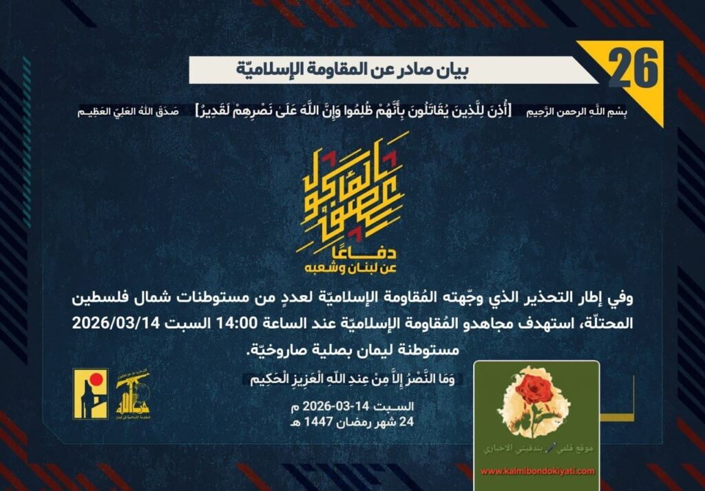 ุฃุตุฏุฑุช ุงู„ู…ู‚ุงูˆู…ุฉ ุงู„ุงุณู„ุงู…ูŠุฉ ุจุนุฏ ุงู„ุจูŠุงู† ุฑู‚ู… (25) ู…ุจุงุดุฑุฉ ุจูŠุงู† ุฑู‚ู…(26) :โ€ุฏูุงุนู‹ุง ุนู† ู„ุจู†ุงู† ูˆุดุนุจู‡ุŒ ูˆููŠ ุฅุทุงุฑ โ€ุงู„ุชุญุฐูŠุฑ ุงู„ุฐูŠ ูˆุฌู‘ู‡ุชู‡ ุงู„ู…ูู‚ุงูˆู…ุฉ ุงู„ุฅุณู„ุงู…ูŠู‘ุฉ ู„ุนุฏุฏู ู…ู† ู…ุณุชูˆุทู†ุงุช ุดู…ุงู„ ูู„ุณุทูŠู† ุงู„ู…ุญุชู„ู‘ุฉุŒ ุงุณุชู‡ุฏู ู…ุฌุงู‡ุฏูˆ ุงู„ู…ูู‚ุงูˆู…ุฉ ุงู„ุฅุณู„ุงู…ูŠู‘ุฉ ุนู†ุฏ ุงู„ุณุงุนุฉ 14:00 ุงู„ุณุจุช 14/03/2026 ู…ุณุชูˆุทู†ุฉ ู„ูŠู…ุงู† ุจุตู„ูŠุฉ ุตุงุฑูˆุฎูŠู‘ุฉ.