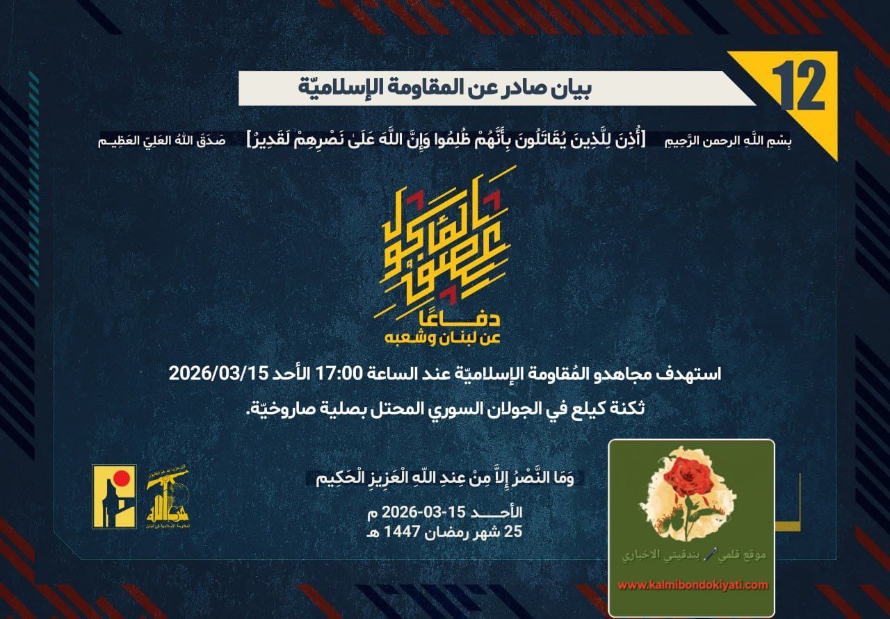 صدر بيان رقم (12) للمقاومة الاسلامية الآتي نصه:”دفاعًا عن لبنان وشعبه، استهدف مجاهدو المُقاومة الإسلاميّة عند الساعة 17:00 الأحد 15/03/2026 ثكنة كيلع في الجولان السوري المحتل بصلية صاروخيّة.