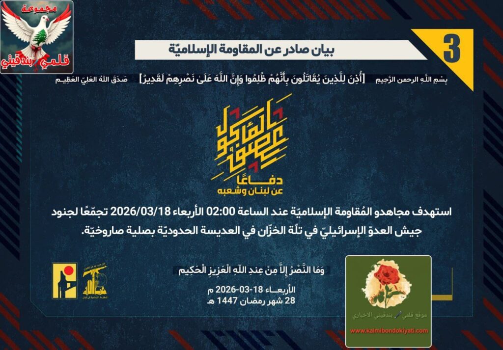 ุตุฏุฑ ุจูุงู ุฑูู ‘2’ ููู ูุงูู ุฉ ุงูุงุณูุงู ูุฉ ุงูุขุชู ูุตู:”ุฏูุงุนูุง ุนู ูุจูุงู ูุดุนุจูุ ุงุณุชูุฏู ู ุฌุงูุฏู ุงูู ููุงูู ุฉ ุงูุฅุณูุงู ููุฉ ุนูุฏ ุงูุณุงุนุฉ 00:30 ุงูุฃุฑุจุนุงุก 18/03/2026 ุชุฌู ูุนูุง ูุฌููุฏ ุฌูุด ุงูุนุฏูู ุงูุฅุณุฑุงุฆูููู ูู ู ูุทูุฉ ุงููุจุนุฉ ุงููุฏูู ุฉ ูู ูุฑูุฉ ุงูุนุฏูุณุฉ ุงูุญุฏูุฏููุฉ ุจุตููุฉู ุตุงุฑูุฎููุฉ.