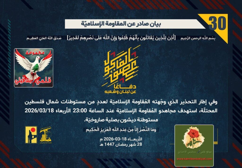 أصدرت المقاومة الاسلامية بعد البيان رقم ’29’ مباشرة بيان رقم ’30’ :”دفاعًا عن لبنان وشعبه، وفي إطار التحذير الذي وجّهته المُقاومة الإسلاميّة لعددٍ من مستوطنات شمال فلسطين المحتلّة، استهدف مجاهدو المُقاومة الإسلاميّة عند الساعة 23:00 الأربعاء 18/03/2026 مستوطنة ديشون بصلية صاروخيّة.