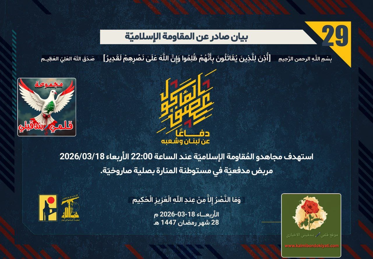 صدر بيان رقم ’29’ للمقاومة الاسلامية الآتي نصه:”دفاعًا عن لبنان وشعبه، استهدف مجاهدو المُقاومة الإسلاميّة عند الساعة 22:00 الأربعاء 18/03/2026 مربض مدفعيّة في مستوطنة المنارة بصلية صاروخيّة.