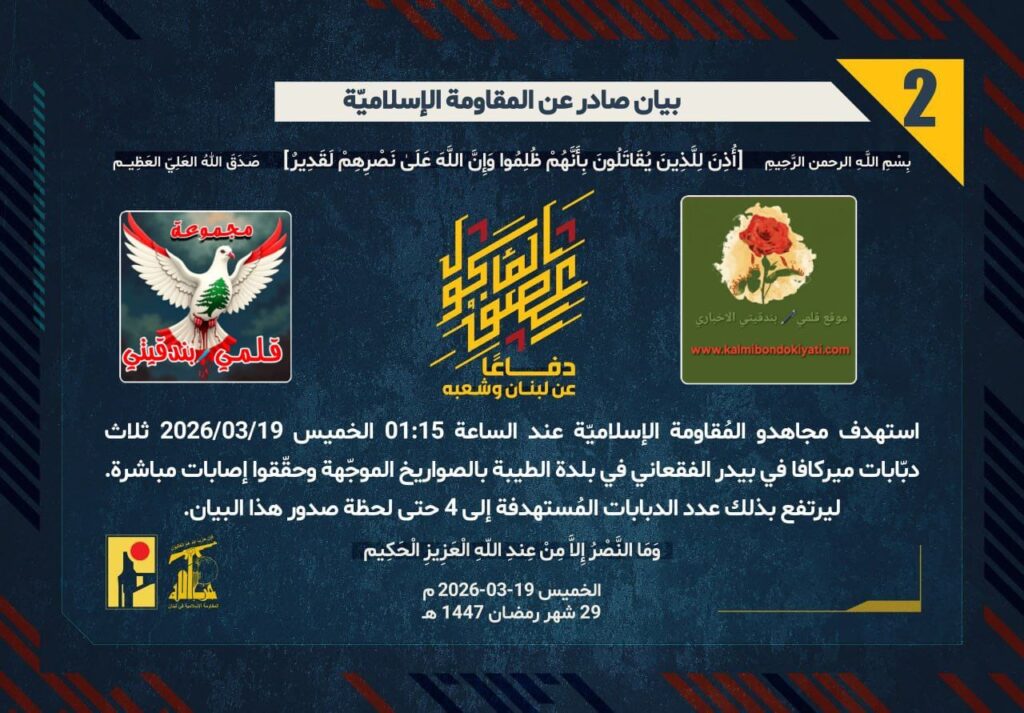 صدر بيان رقم ‘1’ للمقاومة الاسلامية الآتي نصه:”دفاعًا عن لبنان وشعبه، استهدف مجاهدو المُقاومة الإسلاميّة عند الساعة 00:05 الخميس 19/03/2026 دبّابة ميركافا في بيدر الفقعاني في بلدة الطيبة بصاروخ موجّه وحقّقوا إصابة مباشرة.