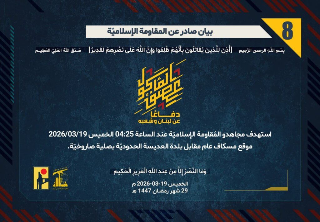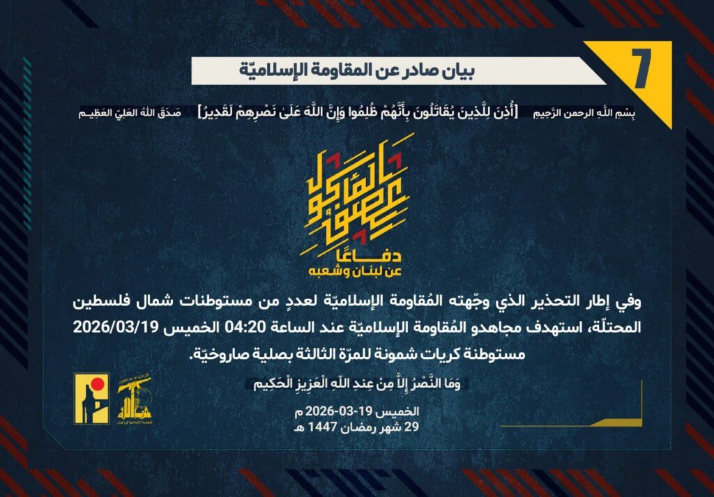 ุชูุงุตู ุงูู ูุงูู ุฉ ุงูุฅุณูุงู ูุฉ ุฅุตุฏุงุฑ ุจูุงูุงุชูุง ุงูุนุณูุฑูุฉ ูู ุงูุนู ู ุงูู ุญุชู ูุนูู ุงูุญุฏูุฏ ูุฌุงุก ูู ุงูุจูุงู ุงูุณุงุจุน ุงูุขุชู ูุตู”:ุฏูุงุนูุง ุนู ูุจูุงู ูุดุนุจูุ ููู ุฅุทุงุฑ โุงูุชุญุฐูุฑ ุงูุฐู ูุฌููุชู ุงูู ููุงูู ุฉ ุงูุฅุณูุงู ููุฉ ูุนุฏุฏู ู ู ู ุณุชูุทูุงุช ุดู ุงู ููุณุทูู ุงูู ุญุชููุฉุ ุงุณุชูุฏู ู ุฌุงูุฏู ุงูู ููุงูู ุฉ ุงูุฅุณูุงู ููุฉ ุนูุฏ ุงูุณุงุนุฉ 04:20 ุงูุฎู ูุณ 19/03/2026 ู ุณุชูุทูุฉ ูุฑูุงุช ุดู ููุฉ ููู ุฑูุฉ ุงูุซุงูุซุฉ ุจุตููุฉ ุตุงุฑูุฎููุฉ.