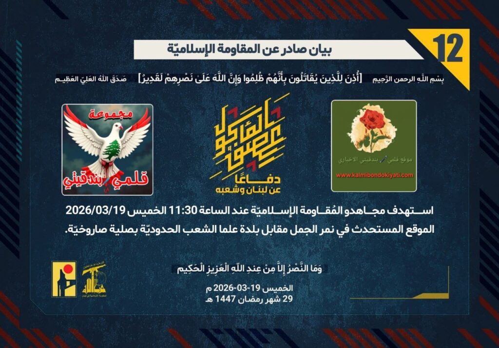 أصدرت المقاومة الاسلامية بعد البيان رقم ’11’ مباشرة بيان رقم ’12’ :”دفاعًا عن لبنان وشعبه، استهدف مجاهدو المُقاومة الإسلاميّة عند الساعة 11:30 الخميس 19/03/2026 الموقع المستحدث في نمر الجمل مقابل بلدة علما الشعب الحدوديّة بصلية صاروخيّة.