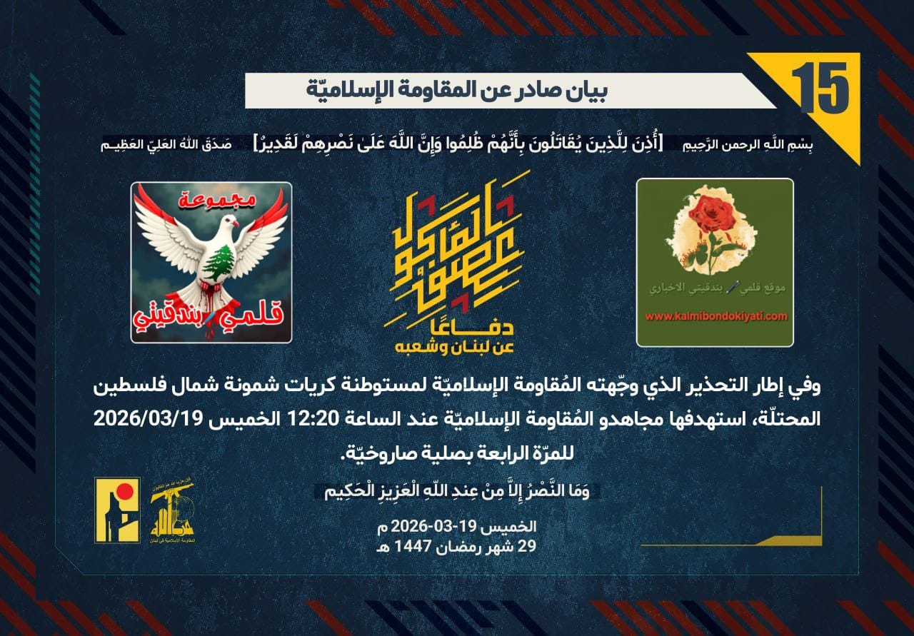ุตุฏุฑ ุจูุงู ุฑูู “15” ููู ูุงูู ุฉ ุงูุงุณูุงู ูุฉ ุงูุขุชู ูุตู:”ุฏูุงุนูุง ุนู ูุจูุงู ูุดุนุจูุ ููู ุฅุทุงุฑ โุงูุชุญุฐูุฑ ุงูุฐู ูุฌููุชู ุงูู ููุงูู ุฉ ุงูุฅุณูุงู ููุฉ ูู ุณุชูุทูุฉ ูุฑูุงุช ุดู ููุฉ ุดู ุงู ููุณุทูู ุงูู ุญุชููุฉุ ุงุณุชูุฏููุง ู ุฌุงูุฏู ุงูู ููุงูู ุฉ ุงูุฅุณูุงู ููุฉ ุนูุฏ ุงูุณุงุนุฉ 12:20 ุงูุฎู ูุณ 19/03/2026 ููู ุฑูุฉ ุงูุฑุงุจุนุฉ ุจุตููุฉ ุตุงุฑูุฎููุฉ.