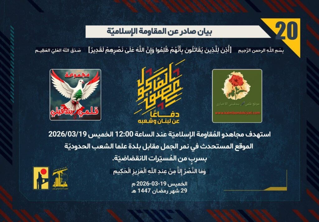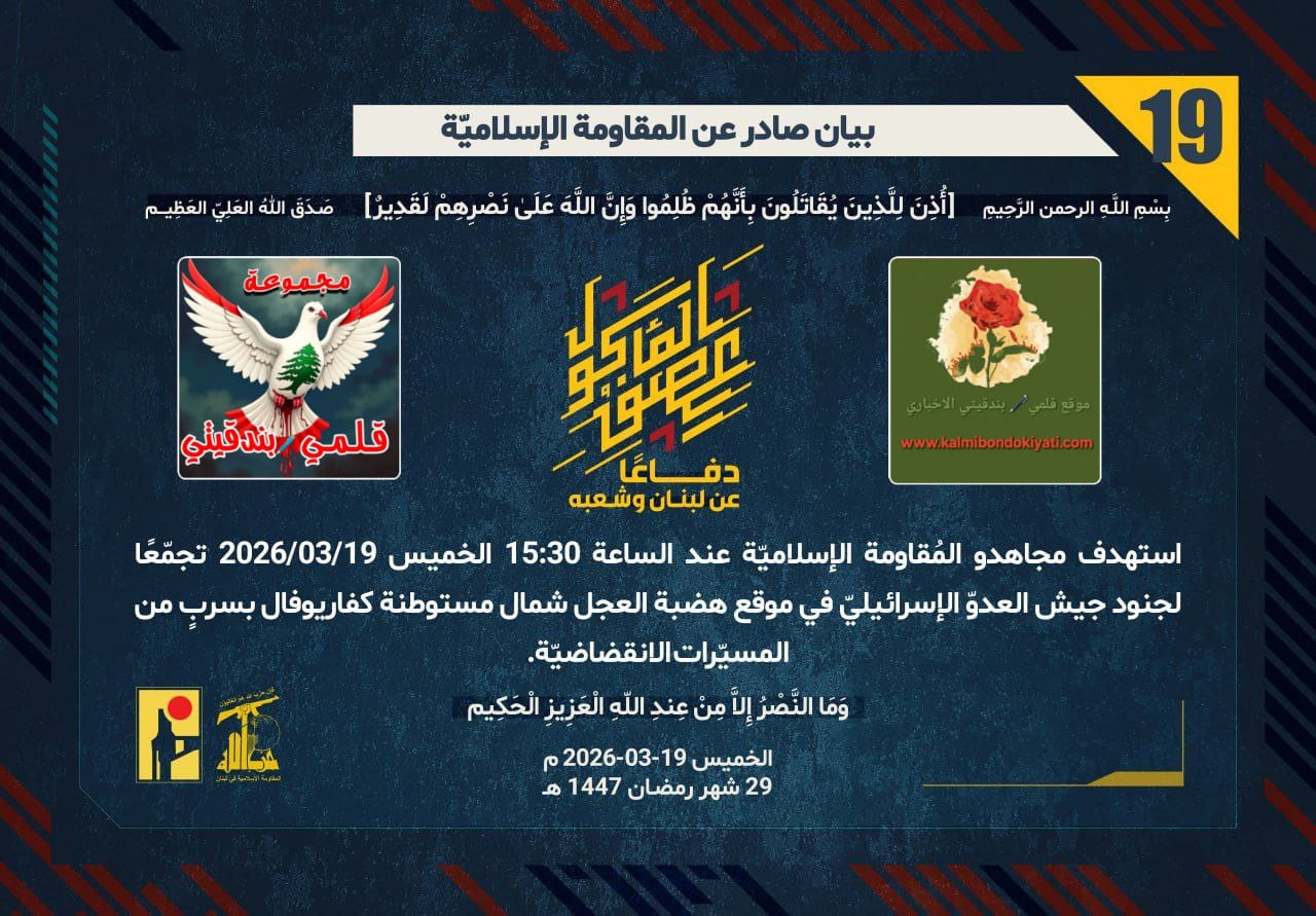 ุตุฏุฑ ุจูุงู ุฑูู ’19’ ููู ูุงูู ุฉ ุงูุงุณูุงู ูุฉ ุงูุขุชู ูุตู:”ุฏูุงุนูุง ุนู ูุจูุงู ูุดุนุจูุ ุงุณุชูุฏู ู ุฌุงูุฏู ุงูู ููุงูู ุฉ ุงูุฅุณูุงู ููุฉ ุนูุฏ ุงูุณุงุนุฉ 15:30 ุงูุฎู ูุณ 19/03/2026 ุชุฌู ูุนูุง ูุฌููุฏ ุฌูุด ุงูุนุฏูู ุงูุฅุณุฑุงุฆูููู ูู ู ููุน ูุถุจุฉ ุงูุนุฌู ุดู ุงู ู ุณุชูุทูุฉ ููุงุฑูููุงู ุจุณุฑุจู ู ู ุงูู ุณููุฑุงุช ุงูุงููุถุงุถููุฉ.