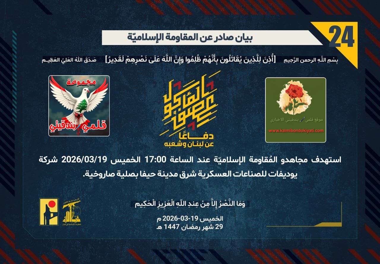 صدر بيان رقم “24” للمقاومة الاسلامية الآتي نصه:”دفاعًا عن لبنان وشعبه، استهدف مجاهدو المُقاومة الإسلاميّة عند الساعة 17:00 الخميس 19/03/2026 شركة يوديفات للصناعات العسكرية شرق مدينة حيفا بصلية صاروخية.