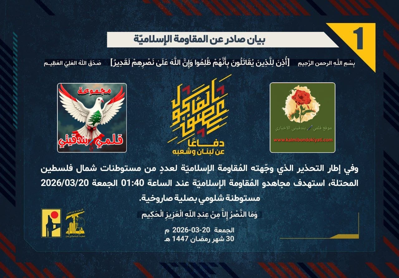 ุตุฏุฑ ุจูุงู ุฑูู “1” ููู ูุงูู ุฉ ุงูุงุณูุงู ูุฉ ุงูุขุชู ูุตู:”ุฏูุงุนูุง ุนู ูุจูุงู ูุดุนุจูุ ููู ุฅุทุงุฑ โุงูุชุญุฐูุฑ ุงูุฐู ูุฌููุชู ุงูู ููุงูู ุฉ ุงูุฅุณูุงู ููุฉ ูุนุฏุฏู ู ู ู ุณุชูุทูุงุช ุดู ุงู ููุณุทูู ุงูู ุญุชูุฉุ ุงุณุชูุฏู ู ุฌุงูุฏู ุงูู ููุงูู ุฉ ุงูุฅุณูุงู ููุฉ ุนูุฏ ุงูุณุงุนุฉ 01:40 ุงูุฌู ุนุฉ 20/03/2026 ู ุณุชูุทูุฉ ุดููู ู ุจุตููุฉ ุตุงุฑูุฎูุฉ.