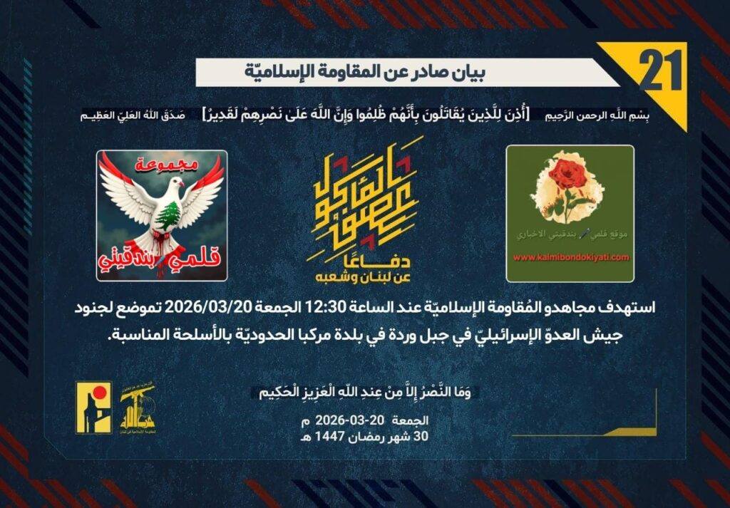 أصدرت المقاومة الاسلامية بعد البيان رقم “20” مباشرة بيان رقم “21” :”دفاعًا عن لبنان وشعبه، استهدف مجاهدو المُقاومة الإسلاميّة عند الساعة 12:30 الجمعة 20/03/2026 تموضع لجنود جيش العدوّ الإسرائيليّ في جبل وردة في بلدة مركبا الحدوديّة بالأسلحة المناسبة.