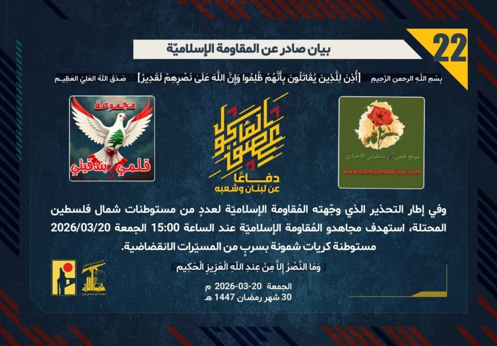 أصدرت المقاومة الاسلامية بعد البيان رقم (20 و 21) مباشرة بيان رقم “22” :”دفاعًا عن لبنان وشعبه، وفي إطار التحذير الذي وجّهته المُقاومة الإسلاميّة لعددٍ من مستوطنات شمال فلسطين المحتلة، استهدف مجاهدو المُقاومة الإسلاميّة عند الساعة 15:00 الجمعة 20/03/2026 مستوطنة كريات شمونة بسربٍ من المسيّرات الانقضاضية.