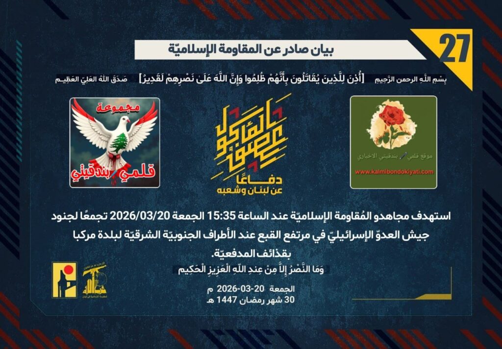 أصدرت المقاومة الاسلامية بعد البيان رقم “26” مباشرة بيان رقم “27” :”دفاعًا عن لبنان وشعبه، استهدف مجاهدو المُقاومة الإسلاميّة عند الساعة 15:35 الجمعة 20/03/2026 تجمعًا لجنود جيش العدوّ الإسرائيليّ في مرتفع القبع عند الأطراف الجنوبيّة الشرقيّة لبلدة مركبا بقذائف المدفعيّة.