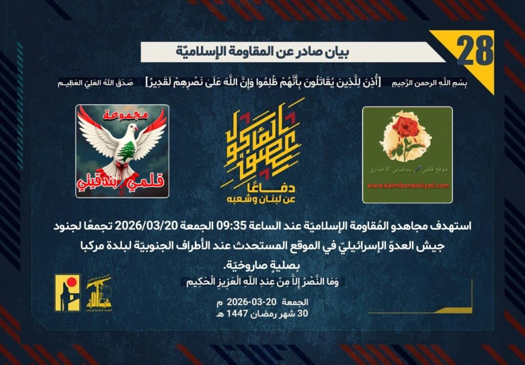 أصدرت المقاومة الاسلامية بعد البيان رقم (26 و 27) مباشرة بيان رقم “28” :”دفاع ًا عن لبنان وشعبه، استهدف مجاهدو المُقاومة الإسلاميّة عند الساعة 09:35 الجمعة 20/03/2026 تجمعًا لجنود جيش العدوّ الإسرائيليّ في الموقع المستحدث عند الأطراف الجنوبيّة لبلدة مركبا بصليةٍ صاروخيّة.