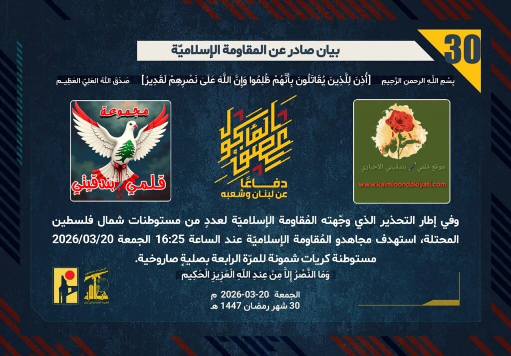 أصدرت المقاومة الاسلامية بعد البيان رقم “29” مباشرة بيان رقم “30” :”دفاعًا عن لبنان وشعبه، وفي إطار التحذير الذي وجّهته المُقاومة الإسلاميّة لعددٍ من مستوطنات شمال فلسطين المحتلة، استهدف مجاهدو المُقاومة الإسلاميّة عند الساعة 16:25 الجمعة 20/03/2026 مستوطنة كريات شمونة للمرّة الرابعة بصليةٍ صاروخية.