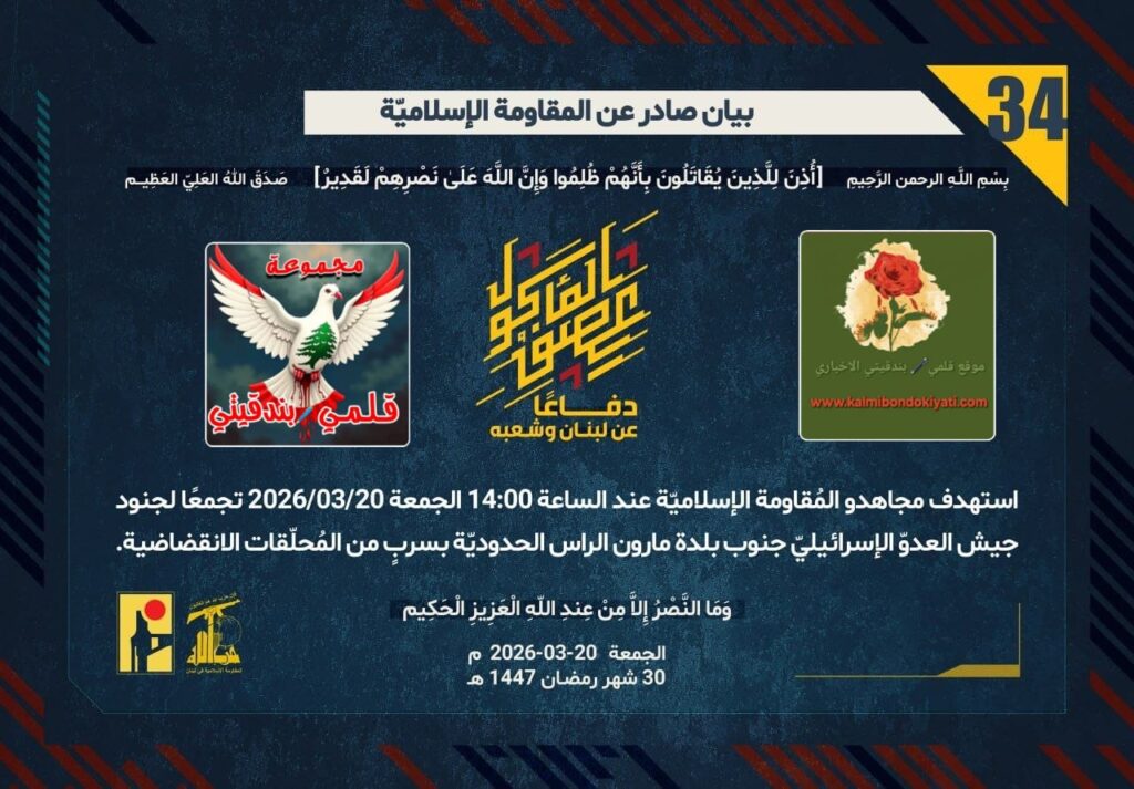 ุฃุตุฏุฑุช ุงูู ูุงูู ุฉ ุงูุงุณูุงู ูุฉ ุจุนุฏ ุงูุจูุงู ุฑูู “33” ู ุจุงุดุฑุฉ ุจูุงู ุฑูู “34” :โุฏูุงุนูุง ุนู ูุจูุงู ูุดุนุจูุ ุงุณุชูุฏู ู ุฌุงูุฏู ุงูู ููุงูู ุฉ ุงูุฅุณูุงู ููุฉ ุนูุฏ ุงูุณุงุนุฉ 14:00 ุงูุฌู ุนุฉ 20/03/2026 ุชุฌู ุนูุง ูุฌููุฏ ุฌูุด ุงูุนุฏูู ุงูุฅุณุฑุงุฆูููู ุฌููุจ ุจูุฏุฉ ู ุงุฑูู ุงูุฑุงุณ ุงูุญุฏูุฏููุฉ ุจุณุฑุจู ู ู ุงูู ูุญูููุงุช ุงูุงููุถุงุถูุฉ.