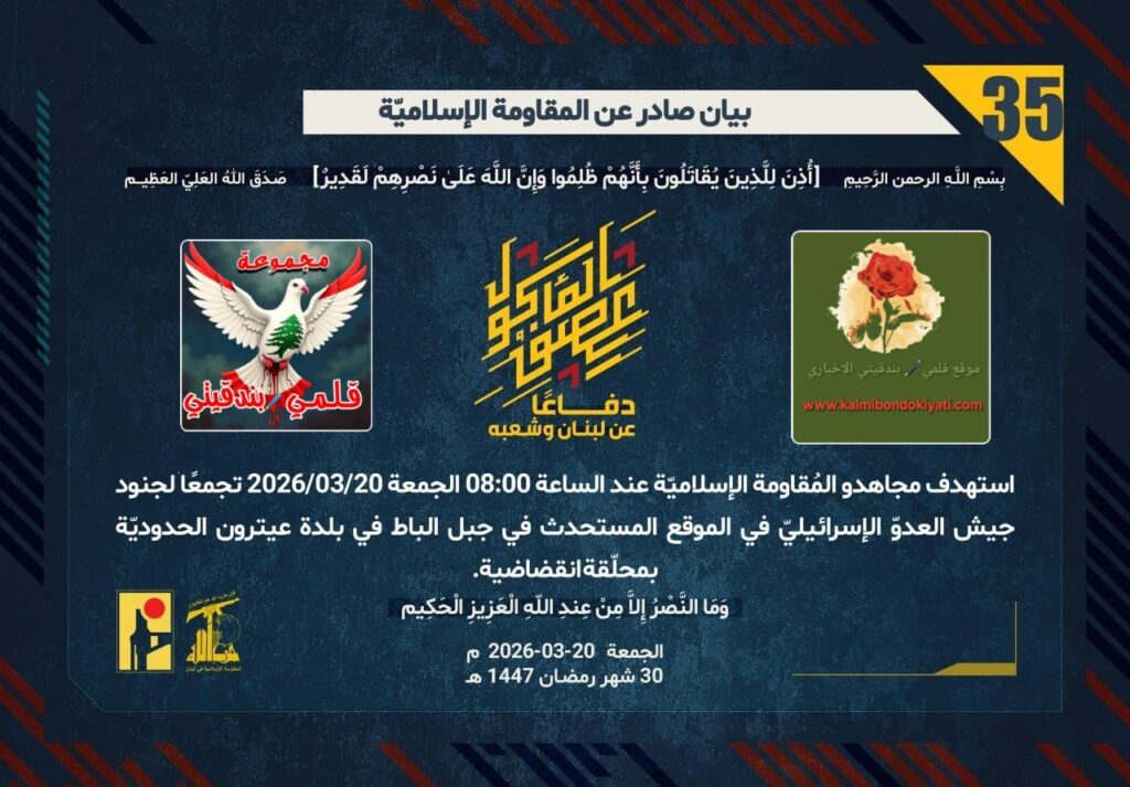 ุฃุตุฏุฑุช ุงูู ูุงูู ุฉ ุงูุงุณูุงู ูุฉ ุจุนุฏ ุงูุจูุงู ุฑูู (33 ู 34) ู ุจุงุดุฑุฉ ุจูุงู ุฑูู (35) :โุฏูุงุนูุง ุนู ูุจูุงู ูุดุนุจูุ ุงุณุชูุฏู ู ุฌุงูุฏู ุงูู ููุงูู ุฉ ุงูุฅุณูุงู ููุฉ ุนูุฏ ุงูุณุงุนุฉ 08:00 ุงูุฌู ุนุฉ 20/03/2026 ุชุฌู ุนูุง ูุฌููุฏ ุฌูุด ุงูุนุฏูู ุงูุฅุณุฑุงุฆูููู ูู ุงูู ููุน ุงูู ุณุชุญุฏุซ ูู ุฌุจู ุงูุจุงุท ูู ุจูุฏุฉ ุนูุชุฑูู ุงูุญุฏูุฏููุฉ ุจู ุญูููุฉ ุงููุถุงุถูุฉ.