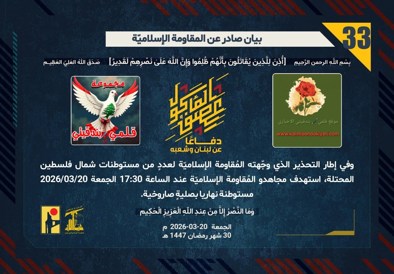 ุตุฏุฑ ุจูุงู ุฑูู “33” ููู ูุงูู ุฉ ุงูุงุณูุงู ูุฉ ุงูุขุชู ูุตู:”ุฏูุงุนูุง ุนู ูุจูุงู ูุดุนุจูุ ููู ุฅุทุงุฑ โุงูุชุญุฐูุฑ ุงูุฐู ูุฌููุชู ุงูู ููุงูู ุฉ ุงูุฅุณูุงู ููุฉ ูุนุฏุฏู ู ู ู ุณุชูุทูุงุช ุดู ุงู ููุณุทูู ุงูู ุญุชูุฉุ ุงุณุชูุฏู ู ุฌุงูุฏู ุงูู ููุงูู ุฉ ุงูุฅุณูุงู ููุฉ ุนูุฏ ุงูุณุงุนุฉ 17:30 ุงูุฌู ุนุฉ 20/03/2026 ู ุณุชูุทูุฉ ููุงุฑูุง ุจุตููุฉู ุตุงุฑูุฎูุฉ.