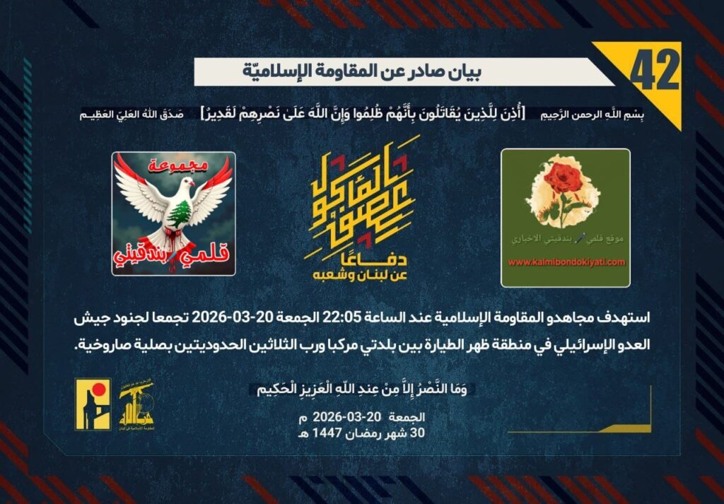 أصدرت المقاومة الاسلامية بعد البيان رقم “41” مباشرة بيان رقم “42” :”دفاعًا عن لبنان وشعبه، استهدف مجاهدو المقاومة الإسلامية عند الساعة 22:05 الجمعة 20-03-2026 تجمّعًا لجنود جيش العدو الإسرائيلي في منطقة ظهر الطيارة بين بلدتي مركبا ورب الثلاثين الحدوديتين بصليةٍ صاروخية.