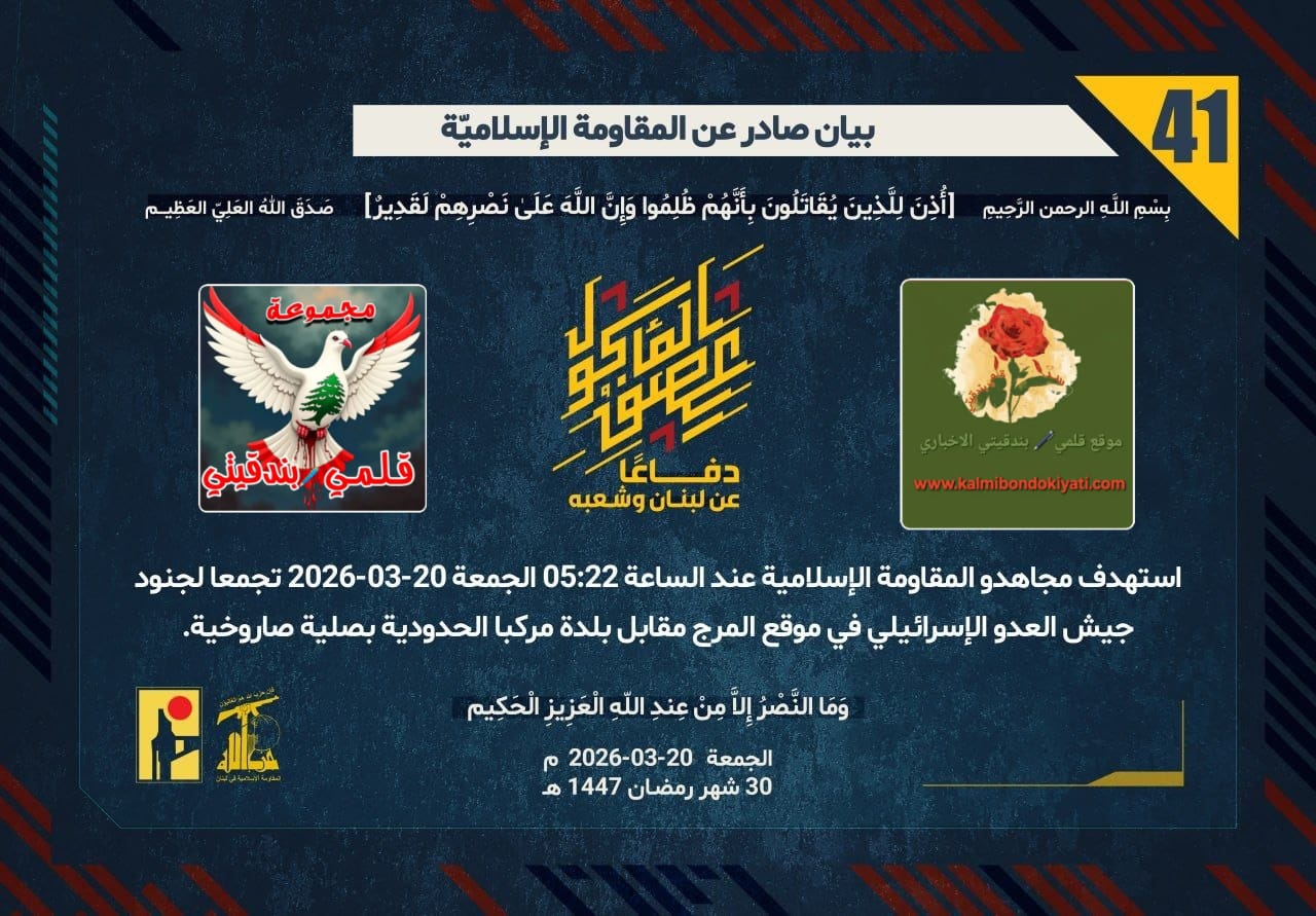 صدر بيان رقم “41” للمقاومة الاسلامية الآتي نصه:”دفاعًا عن لبنان وشعبه، استهدف مجاهدو المقاومة الإسلامية عند الساعة 05:22 الجمعة 20-03-2026 تجمعا لجنود جيش العدو الإسرائيلي في موقع المرج مقابل بلدة مركبا الحدودية بصلية صاروخية.