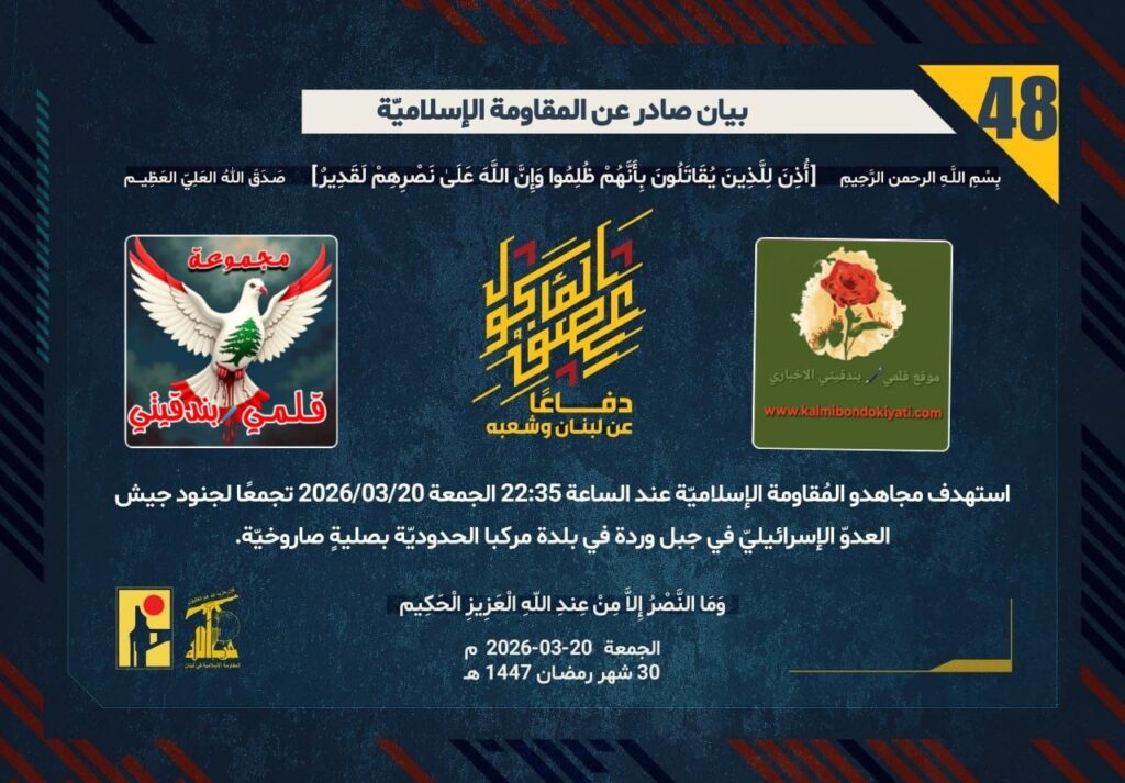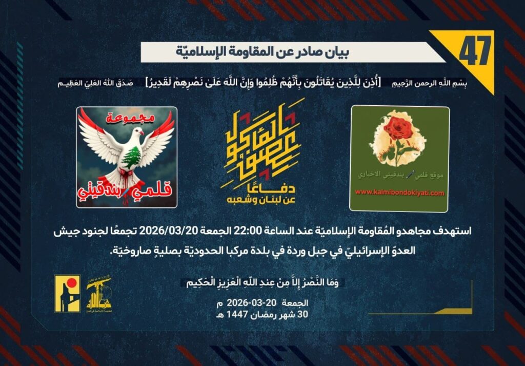 ุฃุตุฏุฑุช ุงูู ูุงูู ุฉ ุงูุงุณูุงู ูุฉ ุจุนุฏ ุงูุจูุงู ุฑูู ’46’ ู ุจุงุดุฑุฉ ุจูุงู ุฑูู ’47’ :โุฏูุงุนูุง ุนู ูุจูุงู ูุดุนุจูุ ุงุณุชูุฏู ู ุฌุงูุฏู ุงูู ููุงูู ุฉ ุงูุฅุณูุงู ููุฉ ุนูุฏ ุงูุณุงุนุฉ 22:00 ุงูุฌู ุนุฉ 20/03/2026 ุชุฌู ุนูุง ูุฌููุฏ ุฌูุด ุงูุนุฏูู ุงูุฅุณุฑุงุฆูููู ูู ุฌุจู ูุฑุฏุฉ ูู ุจูุฏุฉ ู ุฑูุจุง ุงูุญุฏูุฏููุฉ ุจุตููุฉู ุตุงุฑูุฎููุฉ.