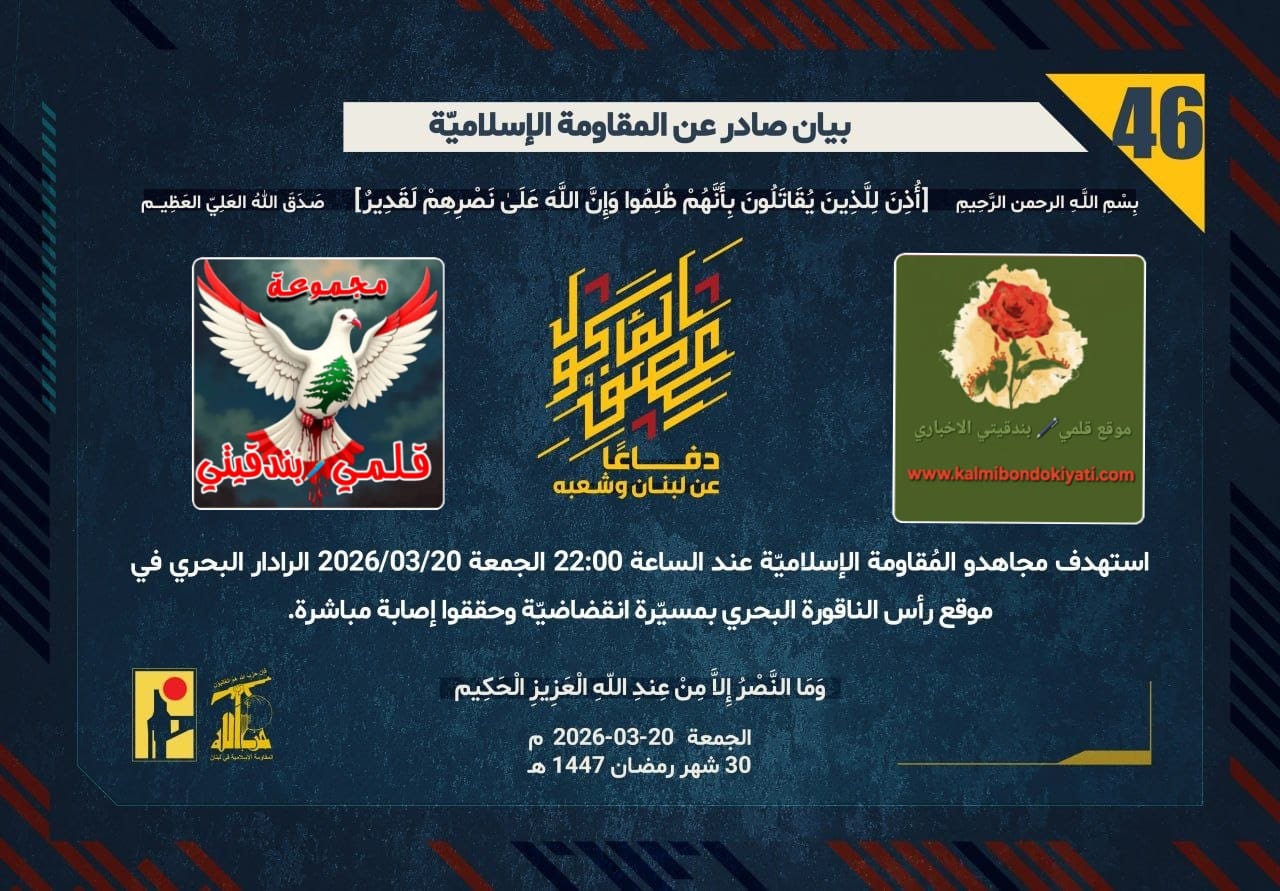 ุตุฏุฑ ุจูุงู ุฑูู ’46’ ููู ูุงูู ุฉ ุงูุงุณูุงู ูุฉ ุงูุขุชู ูุตู:”ุฏูุงุนูุง ุนู ูุจูุงู ูุดุนุจูุ ุงุณุชูุฏู ู ุฌุงูุฏู ุงูู ููุงูู ุฉ ุงูุฅุณูุงู ููุฉ ุนูุฏ ุงูุณุงุนุฉ 22:00 ุงูุฌู ุนุฉ 20/03/2026 ุงูุฑุงุฏุงุฑ ุงูุจุญุฑู ูู ู ููุน ุฑุฃุณ ุงููุงููุฑุฉ ุงูุจุญุฑู ุจู ุณููุฑุฉ ุงููุถุงุถููุฉ ูุญูููุง ุฅุตุงุจุฉ ู ุจุงุดุฑุฉ.