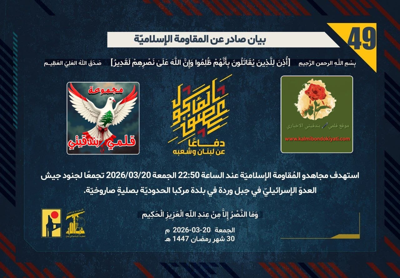 صدر بيان رقم “49” للمقاومة الاسلامية الآتي نصه:”دفاعًا عن لبنان وشعبه، استهدف مجاهدو المُقاومة الإسلاميّة عند الساعة 22:50 الجمعة 20/03/2026 تجمعًا لجنود جيش العدوّ الإسرائيليّ في جبل وردة في بلدة مركبا الحدوديّة بصليةٍ صاروخيّة.