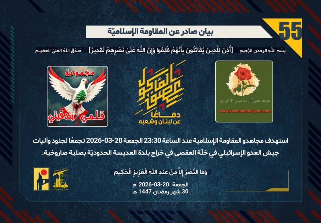 أصدرت المقاومة الاسلامية بعد البيان رقم “54” مباشرة بيان رقم “55” :”دفاعًا عن لبنان وشعبه، استهدف مجاهدو المقاومة الإسلامية عند الساعة 23:30 الجمعة 20-03-2026 تجمعًا لجنود وآليات جيش العدو الإسرائيلي في خلّة العقصى في خراج بلدة العديسة الحدوديّة بصلية صاروخية.