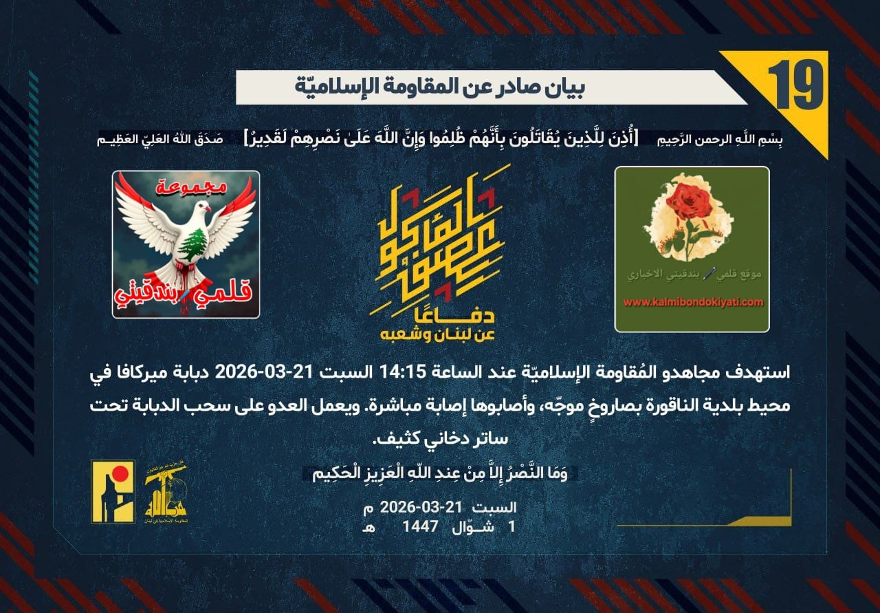 صدر بيان رقم “19” للمقاومة الاسلامية الآتي نصه:”دفاعًا عن لبنان وشعبه، استهدف مجاهدو المُقاومة الإسلاميّة عند الساعة 14:15 السبت 21-03-2026 دبابة ميركافا في محيط بلدية الناقورة بصاروخٍ موجّه، وأصابوها إصابة مباشرة. ويعمل العدو على سحب الدبابة تحت ساتر دخاني كثيف.